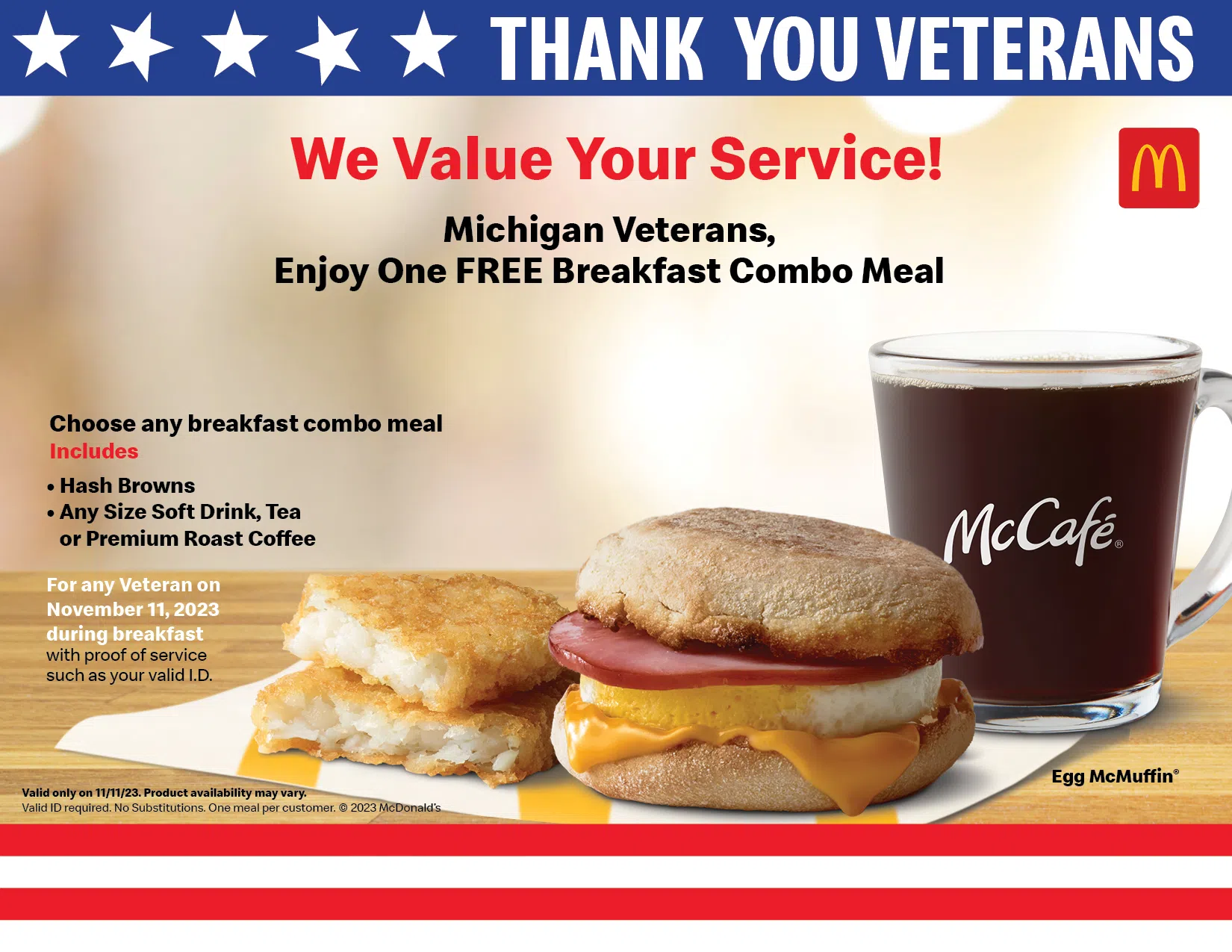 This year, participating McDonald’s restaurants in Michigan will be recognizing Veterans Day by offering current and former military members a free breakfast combo meal.