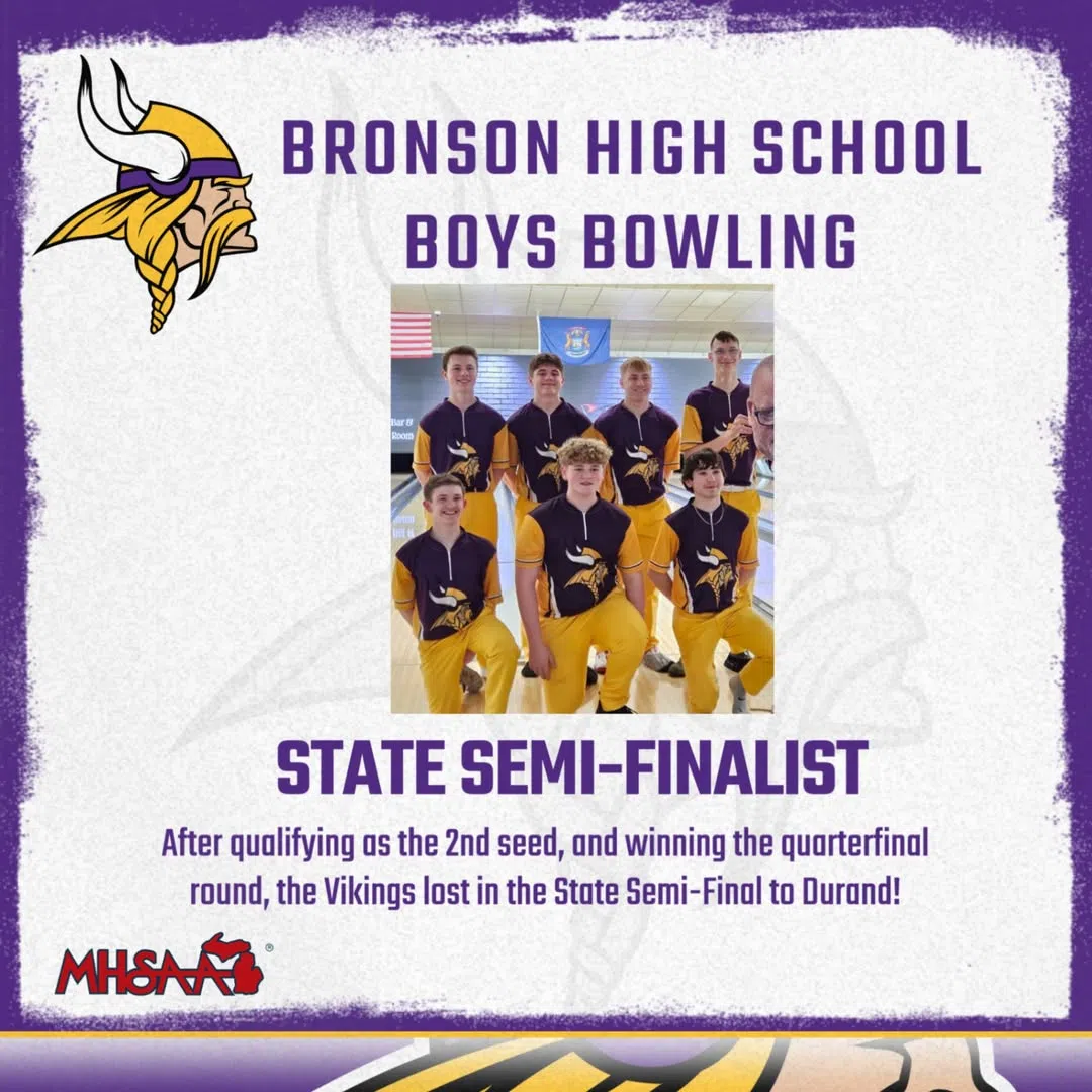 JACKSON, MI (WTVB) – Bronson’s boys bowling team made it to the semifinals of the MHSAA Division 3 Team Finals Friday at Jax 60 in Jackson, but lost to the eventual champion Durand Railroaders.